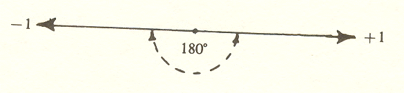 Recall that negative numbers were pictured as extending in a direction opposite to positive numbers. In this way, the square roots of unity, +1 and -1, can be expressed as the opposite ends of a line with center zero. This line can be thought of as an angle of 180 degrees, or a diameter.