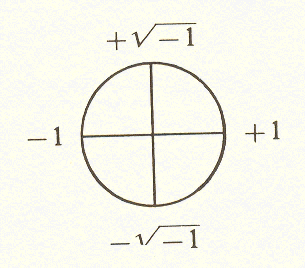Mathematics had arrived at the concept of a number as having roots; numbers which, multiplied together, will produce that number. When the concept of negative numbers came along, there was a clash. What would be the two numbers which multiplied together would produce a negative quantity, -1, for example? For a time there was no answer. The square root of a negative quantity must be impossible. So it was called imaginary. But when Gauss, called by Bell the prince of mathematicians, found a method for representing imaginary numbers, it was not long before their value was appreciated, and today they are just as important as real numbers. This method uses the Argand diagram, which, in essence, correlates unity to the circle, and roots of unity to fractions of the circle.